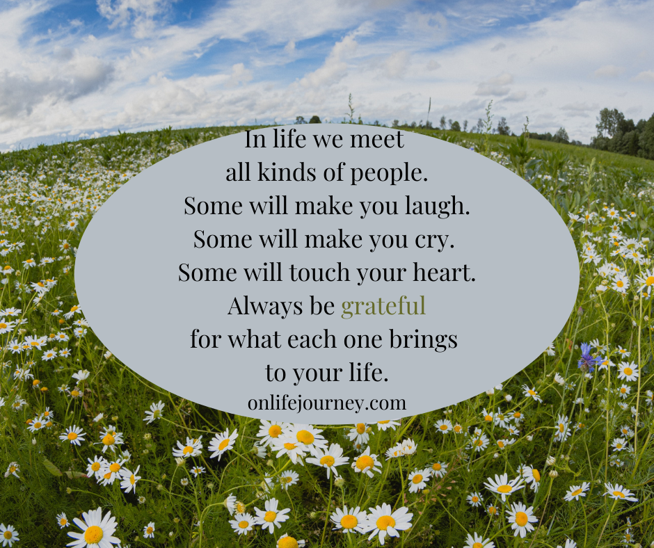 In life we meet all kinds of people. Some will make you laugh. Some will make you cry. Some will touch your heart.Always be gratefulfor what each one brings to your life.